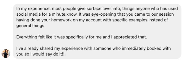 You’ll get three 60-minute coaching sessions, spaced two weeks apart—designed to give you time to implement, reflect, and come back with fresh insight. Each session is tailored to your goals, your business, and your brand.